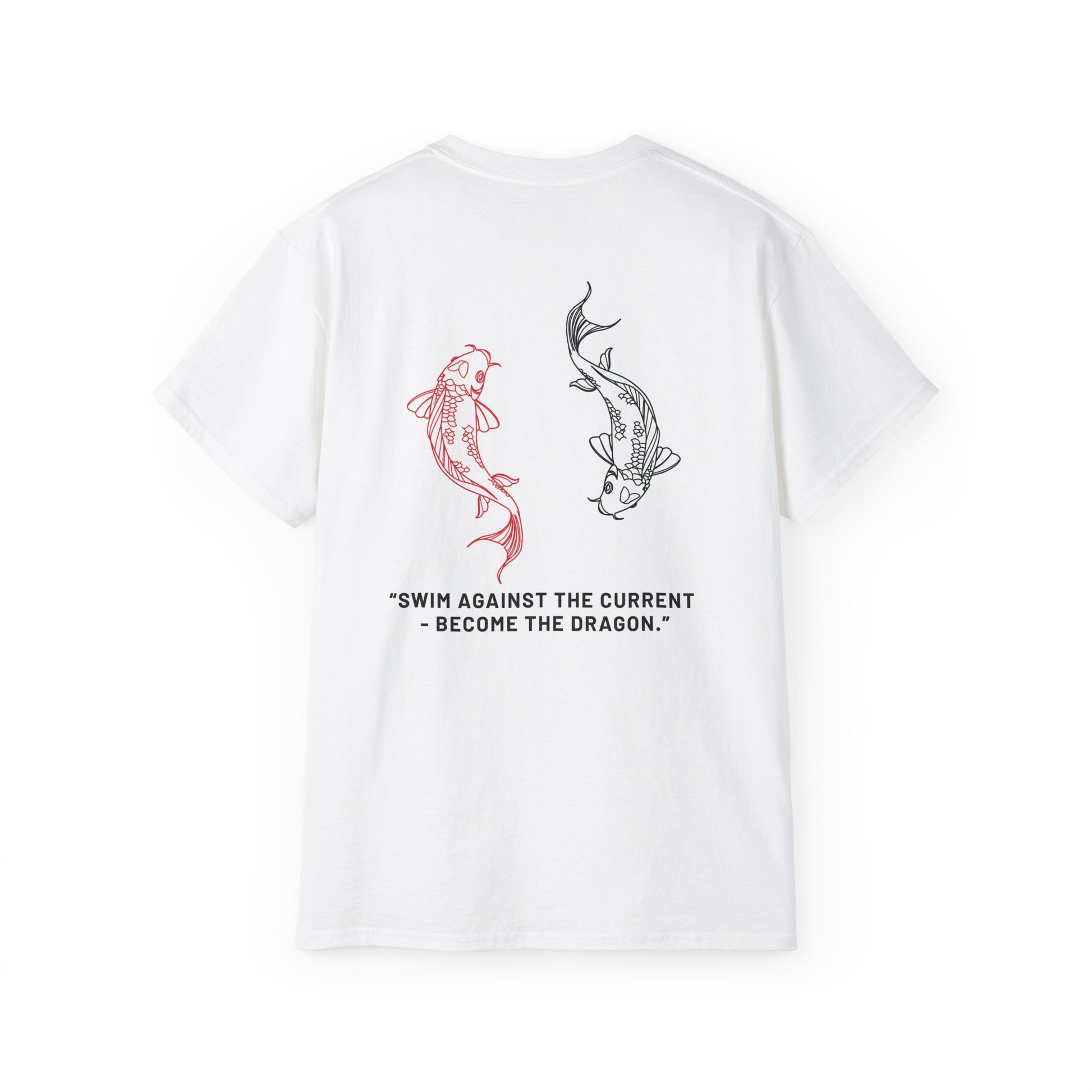Emboldening Koi Fish Tee, Inspirational Quote Shirt, Swim Against the Current Shirt, Dragon Motif T-Shirt, Unisex Motivational Apparel
